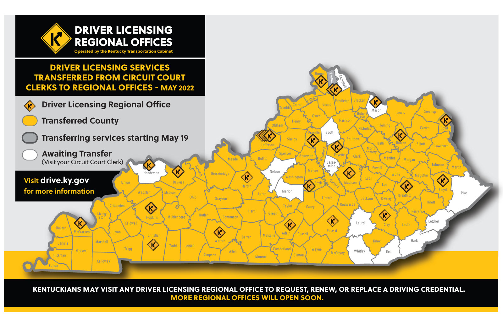 The two Kenton County Office of Circuit Court Clerk locations will become Driver Licensing Regional Offices operated by the Kentucky Transportation Cabinet.