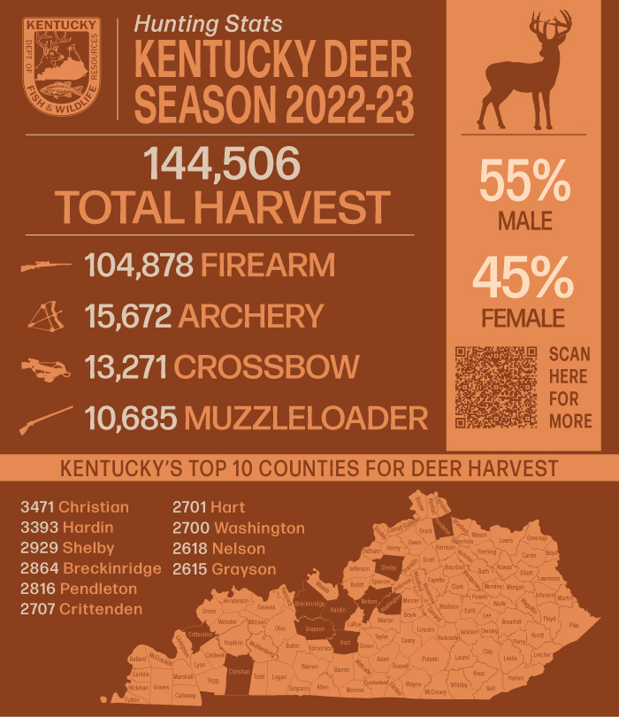 FRANKFORT, Ky. (Jan. 26, 2023) — Hunters in Kentucky harvested more white-tailed deer during the 2022-23 season than the season before and posted an overall harvest total rivaling some of the highest on record.